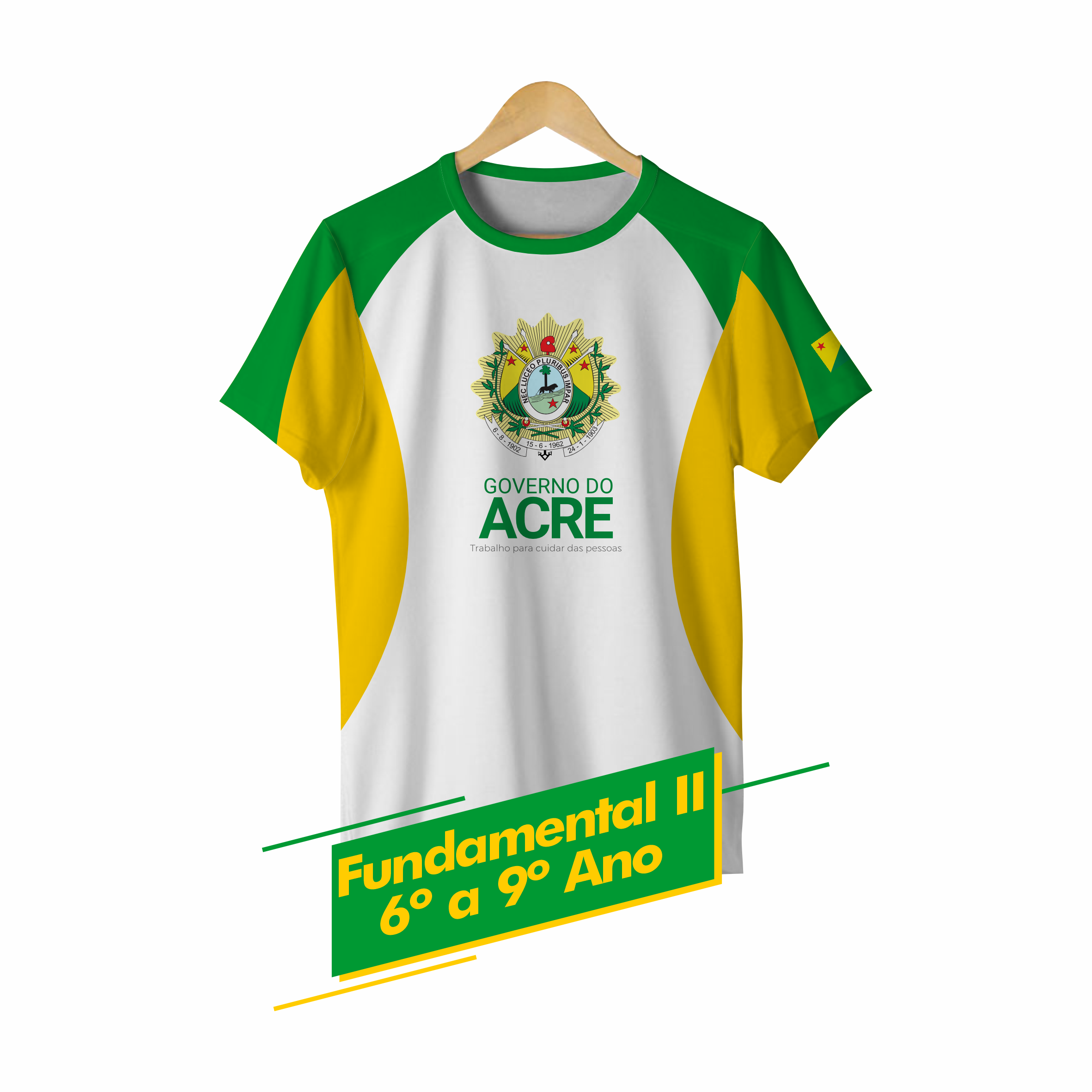 CAMISA EM MALHA POLIÉSTER BRANCA 165G, GOLA EM RIBANA, MANGAS VERDE BANDEIRA COM FAIXA AZUL ROYAL CENTRALIZADA E ACABAMENTO EM EMBANHADO, FRENTE E COSTA COM COSTURAS AZUL ROYAL E VERDE BANDEIRA, BRASÃO DO ESTADO SUBLIMADO NA FRENTE, NOME DA ESCOLA SUBLIMADO NA COSTA E BANDEIRA DO ACRE PINTADA NA MANGA LADO ESQUERDO. SEGUE EM ANEXO LAYOUT DE CORTE.